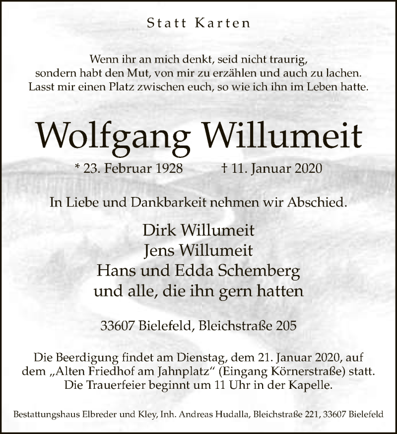 Hier finden Sie alle Traueranzeigen aus der Zeitung, die bisher für Wolfgang Willumeit erschienen sind. Weitere Traueranzeigen, die in der Zeitung erscheinen, werden hier ebenfalls aufgelistet