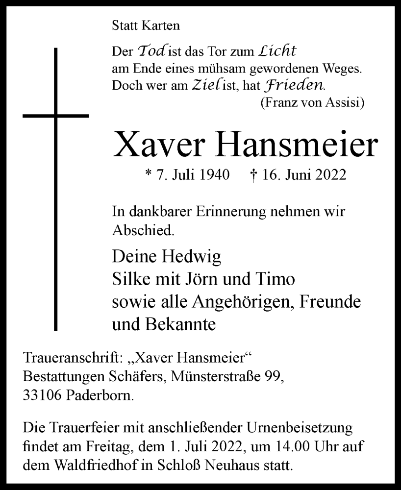 Hier finden Sie alle Traueranzeigen aus der Zeitung, die bisher für Xaver Hansmeier erschienen sind. Weitere Traueranzeigen, die in der Zeitung erscheinen, werden hier ebenfalls aufgelistet